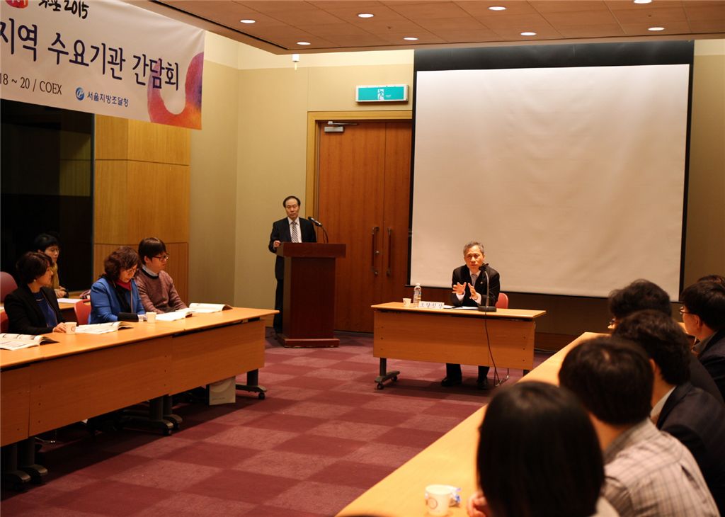 김상규(앞줄 가운데) 조달청장이 서울 삼성동 코엑스에서 열린 ‘서울·경기지역 공공기관 간담회’ 참석자들에게 조달행정을 설명하고 있다.