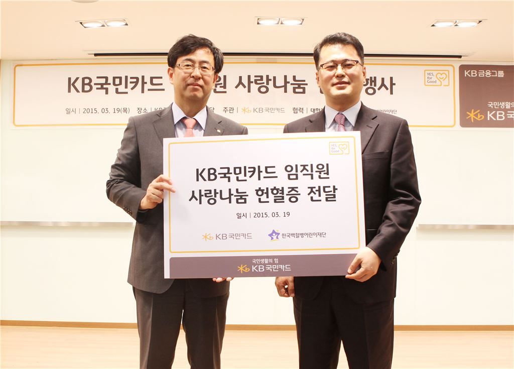 ▲19일 서울시 종로구 KB국민카드 본사에서 백문일 KB국민카드 브랜드전략부 상무(왼쪽)가 서선원 한국백혈병어린이재단 사무처장(오른쪽)에게 '임직원 사랑 나눔 헌혈 행사'에 참여한 KB국민카드 임직원들이 기증한 헌혈증을 전달하고 있다.