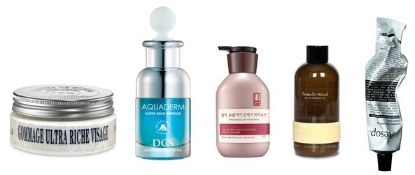 왼쪽부터 록시땅 시어 버터 울트라 리치 페이스 스크럽, DCS(디씨에스) 슈퍼 아쿠아 앰플, 일리 토탈에이징케어 바디로션, 탄 오리엔탈 에센스 배스 & 마사지 오일, 이솝 레버런스 아로마틱 핸드 밤<br /> <br /> <br />