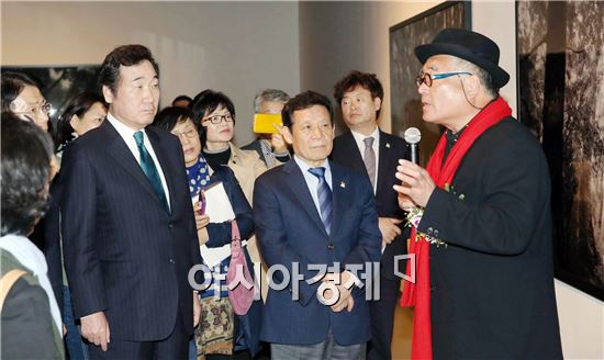 이낙연 도지사와 윤장현 광주시장이 19일 오후 광주시립미술관에서 열린 소나무 사진작가 배병우 초대전 개막식에 참석, 배병우 작가(오른쪽)로부터 전시작품에 대해 설명을 듣고 있다. 사진제공=전남도