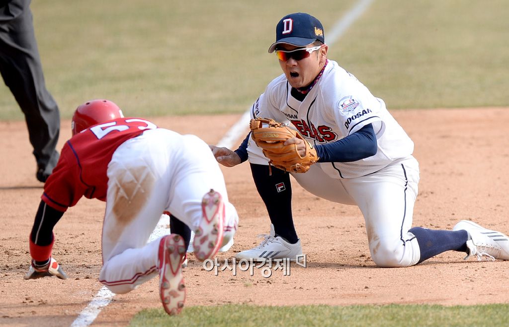 [잠실=아시아경제 김현민 기자]프로야구 2015 KBO리그 KIA 타이거즈와 두산 베어스의 시범경기가 20일 잠실구장에서 열렸다. 9회초 1사 3루에서 KIA 대타 이홍구 타석때 3루주자 최용규가 포수 견제에 걸려 두산 3루수 최주환에 태그아웃되고 있다. 김현민 기자 kimhyun81@asiae.co.kr<ⓒ세계를 보는 창 경제를 보는 눈, 아시아경제(www.asiae.co.kr) 무단전재 배포금지>