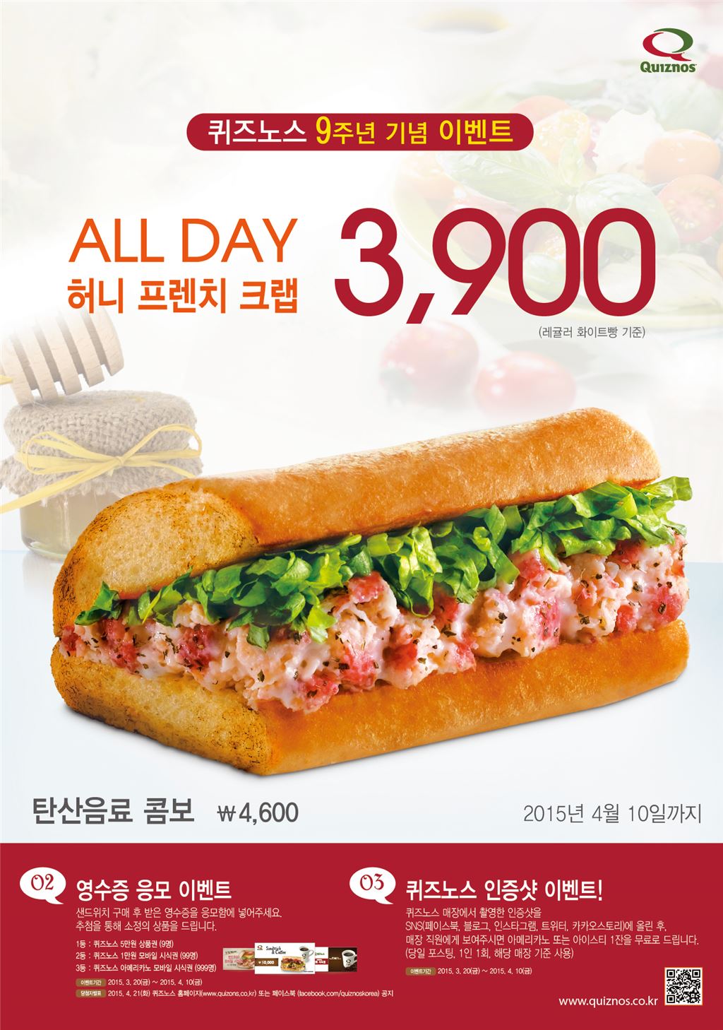 [아시아경제 김소연 기자]프리미엄 샌드위치 전문 카페인 퀴즈노스(㈜유썸)가 한국 론칭 9주년을 맞이해 신제품을 출시하고 ‘9주년 기념 이벤트’를 진행한다고 20일 밝혔다.퀴즈노스는 9주년을 맞이해 골든 허니 버번 치킨(Golden Honey Bourbon Chicken), 허니 프렌치 크랩 (Honey French Crab), 햄앤치즈(Ham & Cheese) 샌드위치 3종을 출시한다. 골드 허니 버번 치킨 샌드위치(레귤러 기준 6000원)는 부드러운 치킨 가슴살과 체다치즈, 양파, 토마토, 양상추와 함께, 달콤새콤한 허니 버번 드레싱과 제스티 그릴 드레싱으로 맛을 더했다. 500㎉ 미만의 중저가 다이어트 제품인 햄앤치즈(4500원)는 벌꿀로 숙성한 햄과 체다치즈, 양상추에 랜치 드레싱를 더해 샌드위치를 가볍게 즐기려는 고객을 위한 제품이다. 허니 프렌치 크랩 샌드위치(4500원)는 게살 특유의 향과 맛이 양파, 양상추, 허니 프렌치 소스와 함께 만나 고소하고 부드러우면서도 달콤한 향을 더했다. 9주년 특별 제품 할인, 매장 이벤트 진행 퀴즈노스는 지난 9년간 퀴즈노스를 사랑해준 고객들에게 감사의 마음을 전하고자 신제품인 ‘허니 프렌치 크랩’ 샌드위치를 3900원에 판매하는 할인 행사를 진행한다. 또 샌드위치 구매 후 영수증을 응모함에 넣으면 추첨을 통해 5만원 상품권 (9명), 1만원 상품권 (99명), 아메리카노 시음권 (999명)을 증정한다. 이외에도 퀴즈노스 매장에서 촬영한 인증샷을 페이스북이나 카카오톡 스토리 같은 소셜네크워크서비스(SNS)에 올린 후 매장 직원에게 보여주면 아메리카노 또는 아이스티를 무료로 증정한다. 퀴즈노스는 올해를 가맹점 오픈 도약의 해로 정하고, 소형 다점화 전략으로 매장 수를 확장하기 위한 노력에 집중할 예정이다. 이에 키오스크 형태의 매장을 완성화시킬 계획이다. 가맹 계약 시 선착순 10명에게 초기투자비 중 1500만원 상당의 혜택을 지원하는 9주년 특별 혜택 프로그램을 진행하며 가맹사업에도 박차를 가할 예정이다. 1대1 맞춤형 사업설명회는 매주 목요일 오후 2시에 진행한다. (가맹문의: 02-425-3131)김소연 기자 nicksy@asiae.co.kr<ⓒ세계를 보는 창 경제를 보는 눈, 아시아경제(www.asiae.co.kr) 무단전재 배포금지>