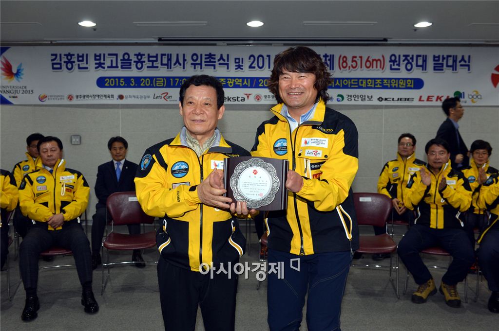 윤장현 광주광역시장은 20일 오후 시청 3층 중회의설에서 광주지역 출신 장애산악인 김홍빈씨를 빛고을홍보대사에 위촉하고, 히말라야 8000m급 14좌 중 열번째 등정에 나선 로체원정대의 등정 성공을 기원했다.