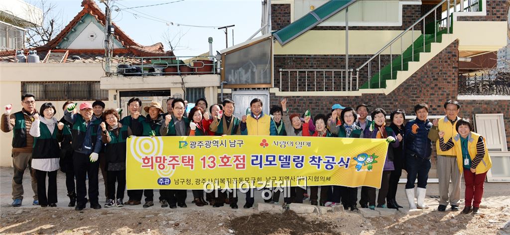 광주 남구는 23일 양림동에서 최영호 남구청장을 비롯한 양림동 동복지호민관협의체, 사랑봉사단 등 30여 명이 참여한 가운데 주거환경이 취약한 소외계층 세대를 위한 무료 집수리 프로젝트 ‘희망주택 13호점 리모델링 착공식’을 가졌다. 사진제공=광주시 남구<br />
