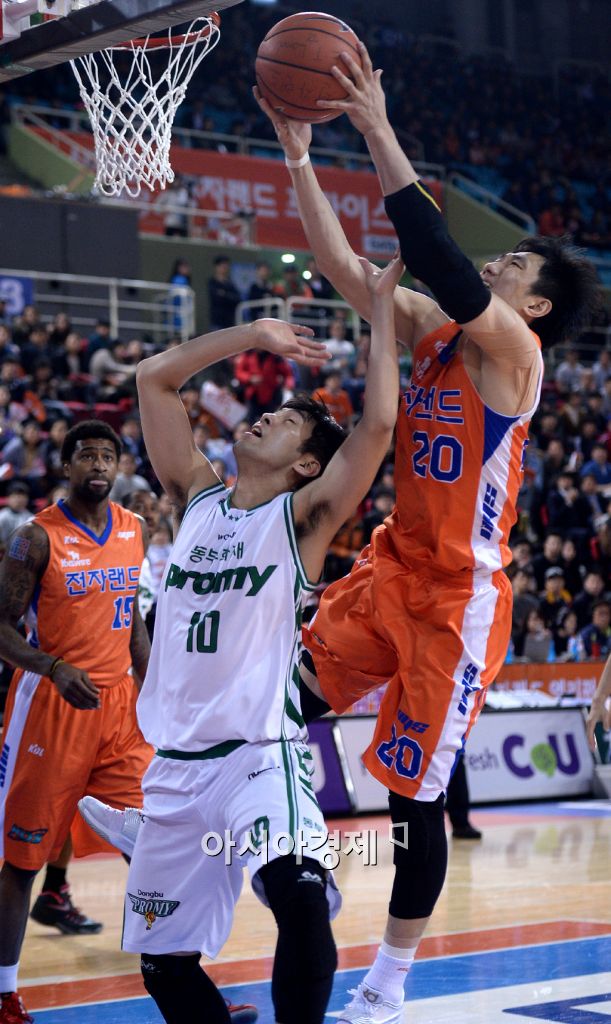 [인천=아시아경제 김현민 기자] 프로농구 인천 전자랜드와 원주 동부의 4강 플레이오프 3차전이 23일 인천 삼산월드체육관에서 열렸다. 전자랜드 정영삼이 상대 김종범과 리바운드를 다투고 있다. 김현민 기자 kimhyun81@asiae.co.kr<ⓒ세계를 보는 창 경제를 보는 눈, 아시아경제(www.asiae.co.kr) 무단전재 배포금지>