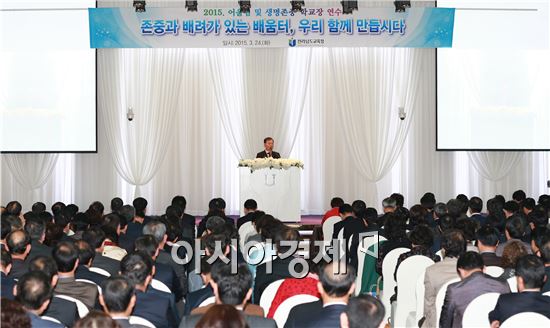 전라남도교육청(교육감 장만채)은 24일 여수 유캐슬 호텔에서 도내 829교 학교장 및 교육지원청 교육지원과장(학생생활지원센터장)이 참석한 가운데 학교폭력 및 자살예방을 위한 '2015. 어울림 및 생명존중 학교장 연수’를 실시했다. <br />