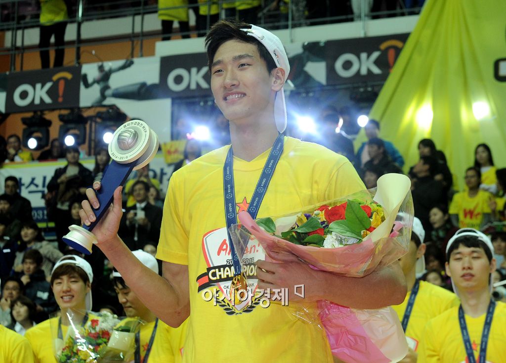 [안산=아시아경제 김현민 기자] 남자 프로배구에 새 시대가 열렸다. 창단 2년 차 OK저축은행이 삼성화재의 독주를 막고 정상에 올랐다. OK저축은행은 1일 안산상록수체육관에서 열린 2014-2015 V리그 남자부 챔피언결정 3차전 홈경기에서 삼성화재를 세트스코어 3-1(25-19 25-19 11-25 25-23)로 꺾고 우승했다. 팀 창단 2년 만에 일궈낸 쾌거. OK저축은행 송명근이 MVP를 수상하고 있다.김현민 기자 kimhyun81@asiae.co.kr<ⓒ세계를 보는 창 경제를 보는 눈, 아시아경제(www.asiae.co.kr) 무단전재 배포금지>김현민 사진기자 kimhyun81@asiae.co.kr<ⓒ아시아 대표 석간 '아시아경제' (www.newsva.co.kr) 무단전재 배포금지>