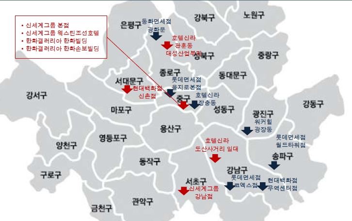 서울 시내 면세점 기존 영업지 및 신규 후보지 (예상) 자료-KB투자증권