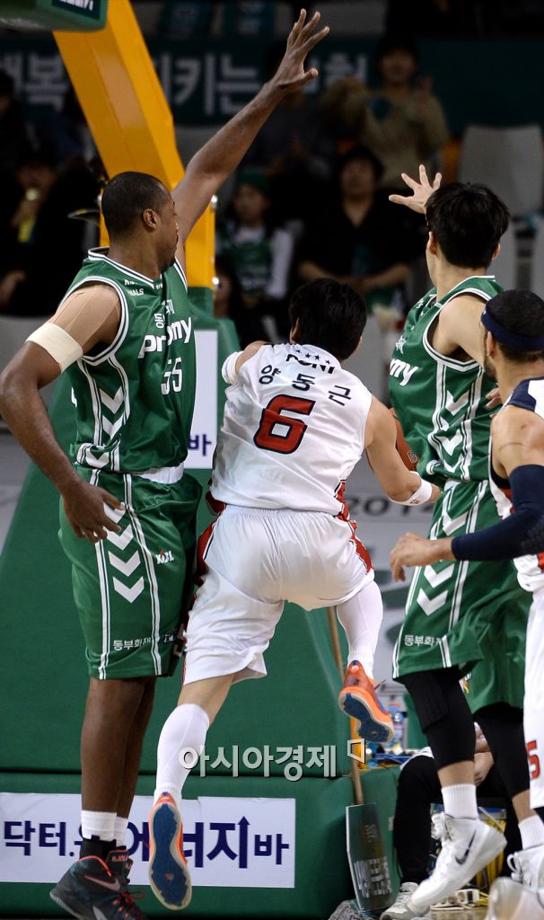 [원주=아시아경제 김현민 기자] 프로농구 원주 동부와 울산 모비스의 챔피언결정 3차전이 2일 원주종합체육관에서 열렸다. 모비스 양동근이 상대 사이먼과 김종범의 수비를 뚫고 공격하고 있다. 김현민 기자 kimhyun81@asiae.co.kr<ⓒ세계를 보는 창 경제를 보는 눈, 아시아경제(www.asiae.co.kr) 무단전재 배포금지>