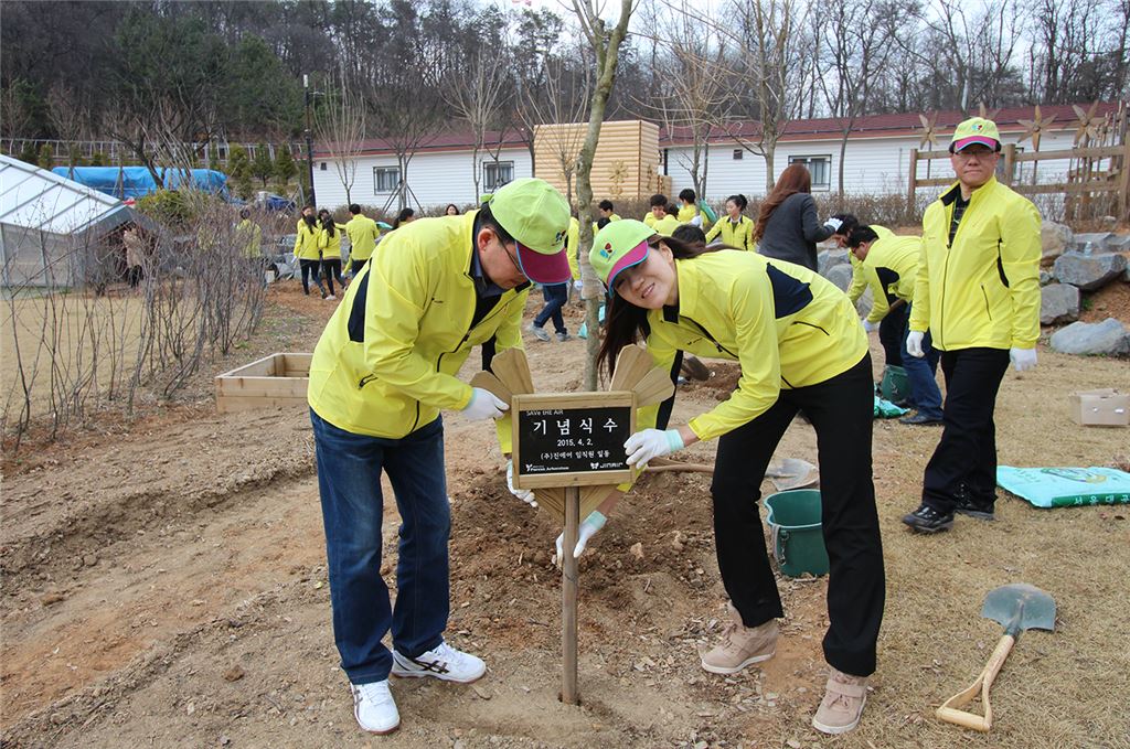2일 오후 서울 구로구 소재 푸른수목원에서 마원 진에어 대표를 포함한 진에어 임직원 등이 식목일 맞이 나무 심기 행사를 진행했다. 진에어는 이날 진에어의 올해 창립 7주년을 기념하는 7그루의 물푸레 나무를 식수했다. 식수 행사 중 마원 진에어 대표(앞 좌측)와 조현민 진에어 마케팅본부장(앞 우측)이 기념 팻말을 설치하고 있다.