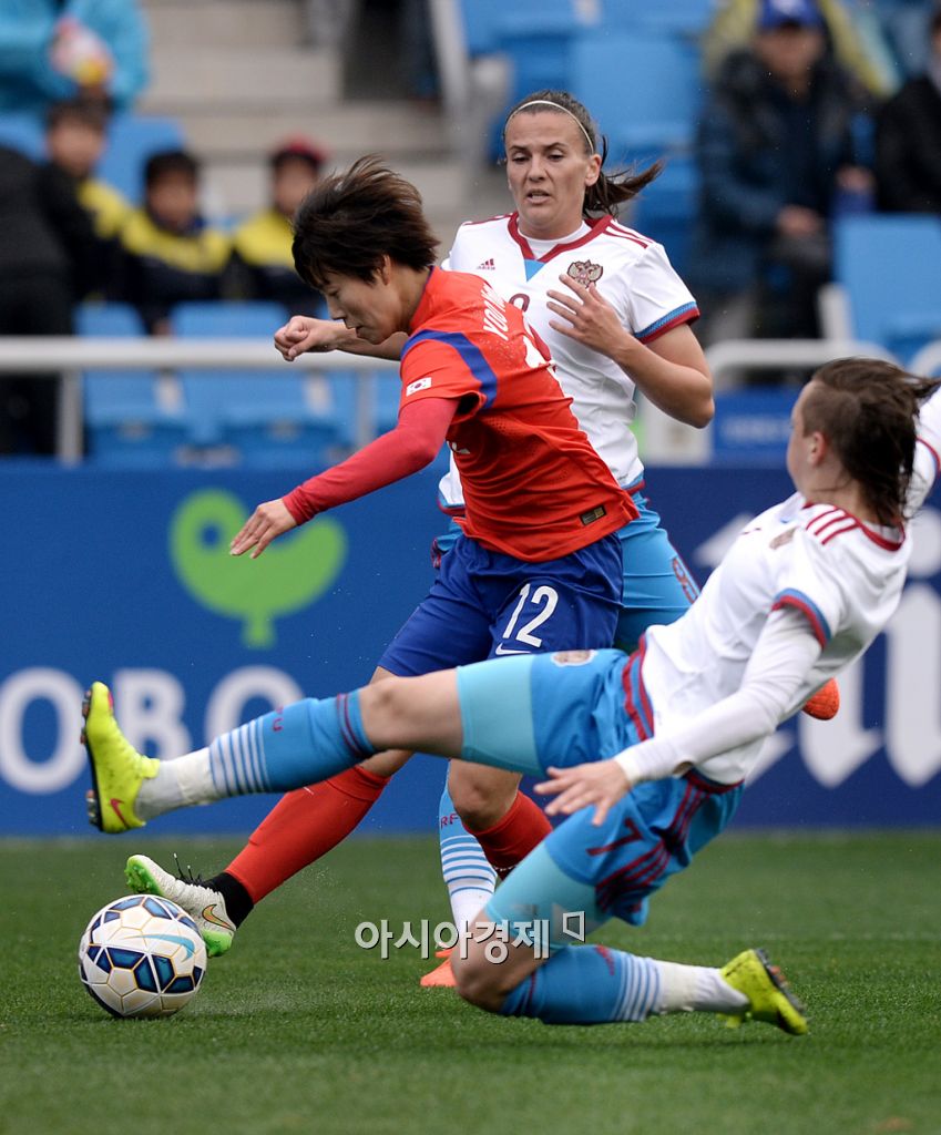 [인천=아시아경제 김현민 기자] 윤덕여 감독이 이끄는 여자 축구 국가대표팀이 5일 인천축구전용경기장에서 러시아와 평가전을 했다. 대표팀 유영아가 상대 수비를 뚫고 슛하고 있다. 김현민 기자 kimhyun81@asiae.co.kr<ⓒ세계를 보는 창 경제를 보는 눈, 아시아경제(www.asiae.co.kr) 무단전재 배포금지>