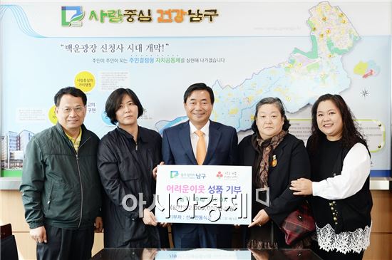 선재전통식품 유세나 대표는 8일 광주시 남구청을 방문, 어려운 이웃을 돕기 위한 사랑의 김치(8kg) 35BOX를 최영호 남구청장에게 전달했다. 사진제공=광주시 남구<br />