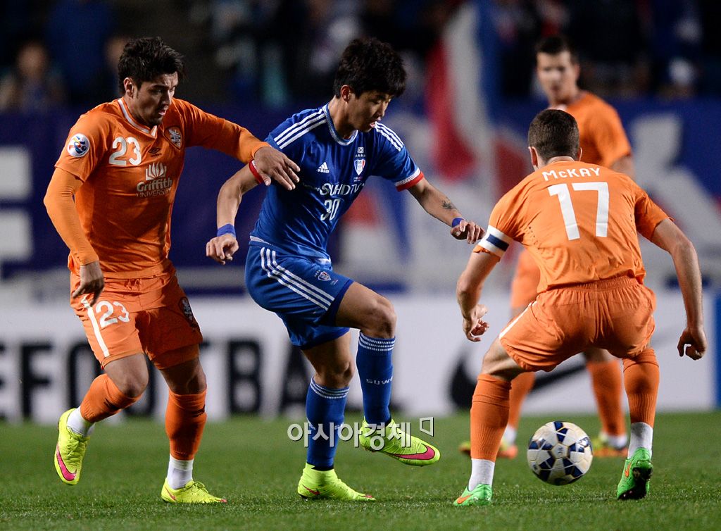 [수원=아시아경제 김현민 기자] 프로축구 수원 삼성이 8일 수원월드컵경기장에서 브리즈번 로어(호주)와 AFC 챔피언스리그 조별리그 G조 4차전을 했다. 수원 신시계가 상대와 공을 다투고 있다. 김현민 기자 kimhyun81@asiae.co.kr<ⓒ세계를 보는 창 경제를 보는 눈, 아시아경제(www.asiae.co.kr) 무단전재 배포금지>