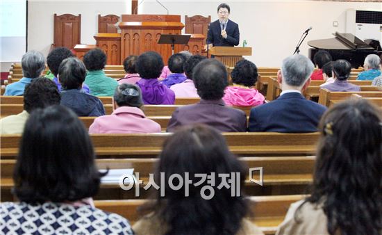 광주 동구는 9일 남광교회에서 경로당 어르신 건강교육을 실시했다. 이날 교육은 조선대 순환기내과 정중화 교수를 강사로 초청하여 ‘심혈관 합병증 예방을 위한 고혈압 관리’요령에 관한 건강교육을 실시했다. 사진제공=광주시 동구