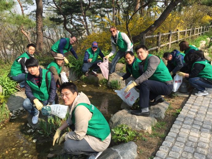 BNP파리바카디프생명 임직원들이 남산공원에서 환경보호 작업을 하면서 기념촬영을 하고 있다.