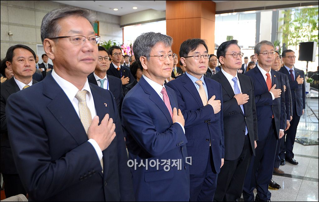 [아시아경제 윤동주 기자] 10일 서울 여의도 금융투자협회에서 열린 금융보안원 출범기념식에 참석한 황영기 금투협 회장(왼쪽부터), 김영린 금융보안원 초대 원장, 임종인 청와대 안보특보, 정우택 국회 정무위원장, 임종룡 금융위원장 등 참석자들이 국민의례를 하고 있다.윤동주 기자 doso7@asiae.co.kr<ⓒ세계를 보는 창 경제를 보는 눈, 아시아경제(www.asiae.co.kr) 무단전재 배포금지>