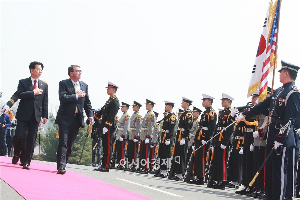 취임 이후 처음으로 한국을 방문한 애슈턴 카터 미국 국방장관이 방한 이틀째인 10일 한민구 국방장관과 회담을 하기위해 국방부에 도착해 의장행사를 갖고있다. (사진=사진공동취재단)