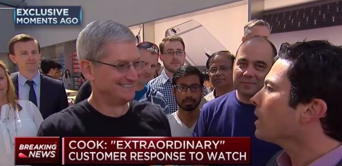 애플워치 출시 6시간만에 미국에서 전 모델 완판팀 쿡이 착용한 스테인레스 스틸 모델에 '레드 크라운' 의미는?[아시아경제 한진주 기자] 팀쿡 애플 CEO가 애플워치 예약판매 당일 애플스토어를 방문해 만족스럽다는 반응을 내비쳤다. 이날 팀쿡이 착용한 모델이 출시된 모델과 달라 애플워치에 추가 옵션을 제공할 가능성도 제기됐다. 애플워치는 10일(현지시간) 전세계에서 온라인 사전예약을 받은 고객들을 대상으로 매장에서 착용할 수 있도록 전시됐다. CNBC와의 인터뷰에서 팀 쿡은 고객들의 반응을 두고 "놀랍다"며 "주문량이 엄청나다"고 말했다. 기자가 팀쿡에게 일상적으로 애플 워치를 착용하냐고 묻자 그는 "종종 밴드를 바꿀 때 시계를 푼다"며 "애플 워치의 스테인레스 스틸 모델과 화이트 컬러의 스포츠용 고무밴드를 좋아한다"고 말했다.CNBC 캡쳐 (출처 : 나인투파이브맥)