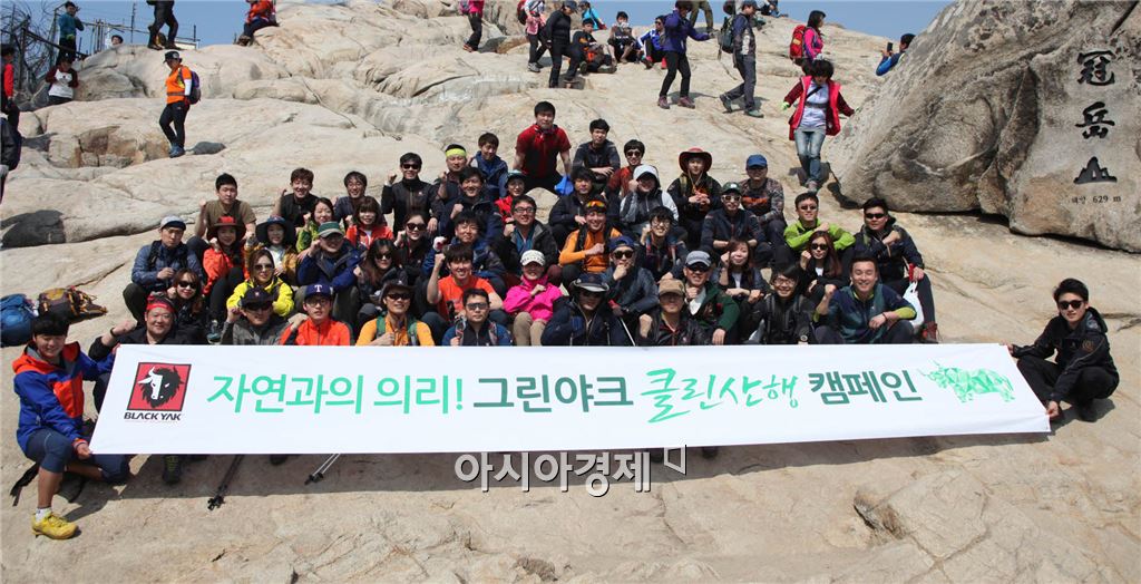 [아시아경제 김현정 기자] 아웃도어 브랜드 블랙야크가 영화배우 김보성이 참여한 가운데 국내 명산을 깨끗하게 만들기 위한 '자연과의 의리! 그린야크 클린산행 캠페인'을 11일 서울 관악산에서 진행했다고 밝혔다.지난 2013년부터 진행해 오고 있는 '그린야크 클린산행 캠페인'은 무심코 산에 버린 쓰레기로 인해 발생하는 문제를 해소하기 위해 블랙야크 임직원과 명산 100도전단 등이 함께 하고 있는 환경보호운동이다.이번 캠페인에는 의리의 사나이, 영화배우 김보성과 함께 블랙야크 임직원, 일반 참가자 등 200여명이 넘는 대규모로 진행됐다. 현장에서 김보성은 "자연과의 의리를 지키기 위해 즐거운 마음으로 참여할 것"이라고 말하며 참가자들에게 환경봉투와 집게, 장갑 등을 나눠줬다. 또한, 직원들을 격려하며 더욱 적극적으로 참여하는 등 분위기를 이끌었다.