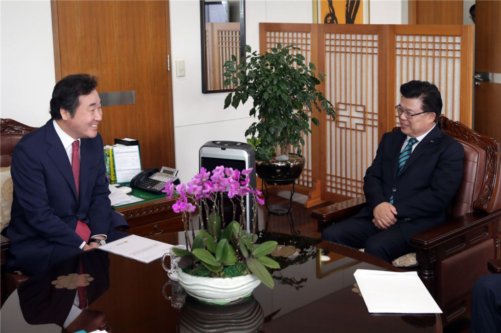 이석형(오른쪽) 산림조합중앙회장과 이낙연 전남도지사가 '숲속의 전남'사업 협력방안 등에 대해 얘기를 나누고 있다.