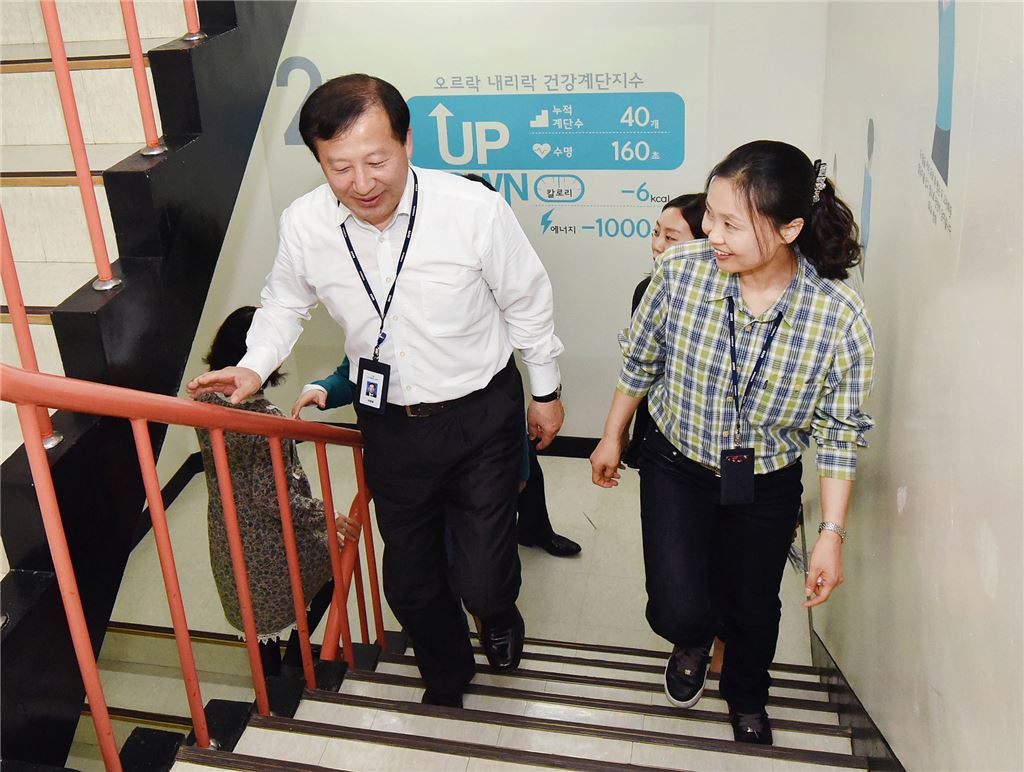 [아시아경제 김대섭 기자] 교보생명은 서울 광화문 본사 빌딩 계단을 임직원들이 즐겁게 오르내릴 수 있는 '오르락(樂) 내리락(樂)' 건강계단으로 꾸몄다고 14일 밝혔다.이번 건강계단은 임직원들로 구성된 그린디자인 자원봉사자들의 아이디어와 자발적 참여로 이루어졌다. 1층부터 8층까지 조성된 건강계단은 매 층마다 누적 계단수와 칼로리 소모량, 그리고 에너지 절감량 등을 재치있는 그래픽으로 표현해 계단을 오르는 사람들이 스스로 운동량과 에너지 절약 효과를 확인할 수 있도록 했다.또 계단을 오르는 바른자세, 업무 중 3분 스트레칭 방법, 그리고 계단을 끝까지 오를 수 있도록 유도하는 재미있는 그림 등으로 직원들이 지루함을 느끼지 않도록 했다. 건강계단은 임직원들을 대상으로 진행하는 2015 건강캠페인 '몸 튼튼, 마음 든든'의 일환으로 기획됐다. 이 캠페인은 체중감량, 허리둘레 감소, 근육량 증가 등 3가지 항목 중 하나를 선택하고 목표수치를 정하는데 20주 후 자신의 목표를 달성하면 미리 약속한 금액을 기부하고 회사에서는 해당금액을 매칭해서 기부하게 된다. 기부금은 건강 소외계층에게 전달된다. 교보생명 관계자는 "건강 계단을 통해 계단을 오르면 유ㆍ무산소 운동을 동시에 할 수 있고 심폐기능을 기르고 골다공증 예방에 효과가 있다"며 "건강관리와 에너지 절약은 모두 작은 실천에서 시작하는 것이 중요하다"고 말했다.김대섭 기자 joas11@asiae.co.kr<ⓒ세계를 보는 창 경제를 보는 눈, 아시아경제(www.asiae.co.kr) 무단전재 배포금지>