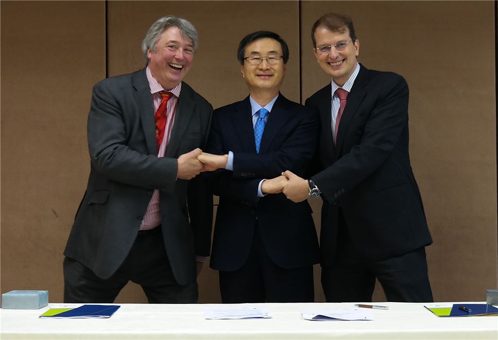 15일(현지시간) 브라질 상파울루 국제기능올림픽 조직위원회에서 (왼쪽부터) 사이먼 바틀리(Simon Bartley) 국제기능올림픽위원회 회장, 송지오 삼성기능올림픽 사무국장, 라파엘 루케시(RAFAEL LUCCHESI) 브라질 국립직업훈련센터(SENAI) 회장이 기능올림픽 후원 조인식을 하고 있다.<br />
