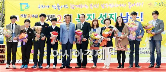광주 남구(구청장 최영호)는 18일 오전 주월동 빅스포 뒤 푸른길 공원에서 지역내 사회복지 종사자와 주민 등 500여 명이 참여한 가운데 ‘웃어라 22만! 남구민이어서 좋아라’라는 주제로 ‘복지성지 남구! 희망나눔 축제’를 개최했다. 사진제공=광주시 남구