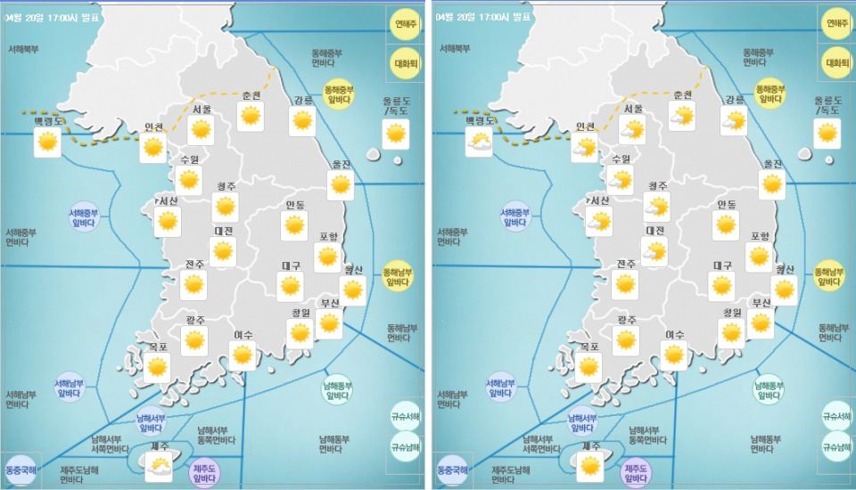 21일 날씨 오전(좌) 오후. 사진제공=기상청