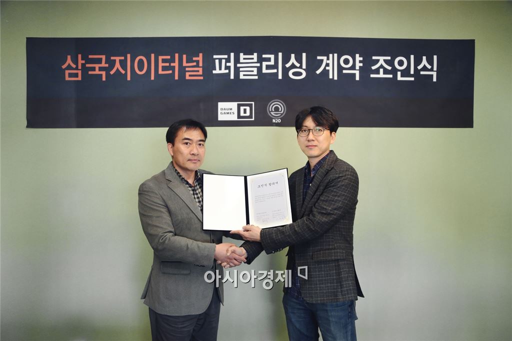 도수환 N20 대표(좌)와 허진영 다음게임 본부장(우)이 '삼국지이터널' 서비스계약을 체결했다.