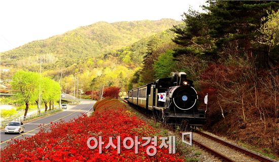 곡성 증기기관차가 철쭉길을 달리고 있다.