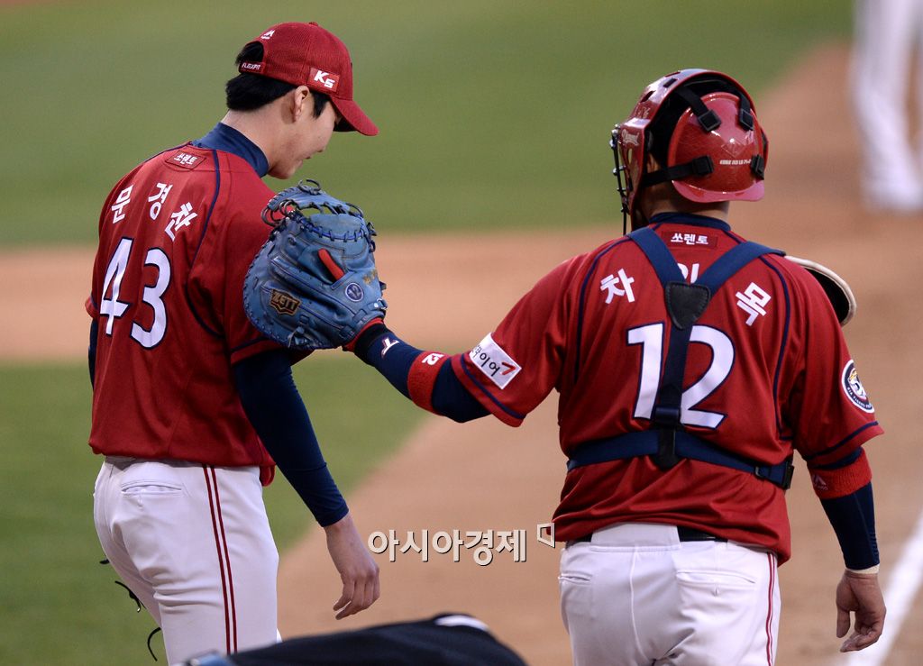 [잠실=아시아경제 김현민 기자] 2015 타이어뱅크 KBO리그 KIA 타이거즈와 두산 베어스의 경기가 24일 잠실야구장에서 열렸다. KIA 선발 문경찬이 1회말 2사 1,2루에서 두산 김재환에게 추가 1타점 적시타를 허용하며 3실점한 뒤 차일목 포수의 위로를 받고 있다. 김현민 기자 kimhyun81@asiae.co.kr<ⓒ세계를 보는 창 경제를 보는 눈, 아시아경제(www.asiae.co.kr) 무단전재 배포금지>