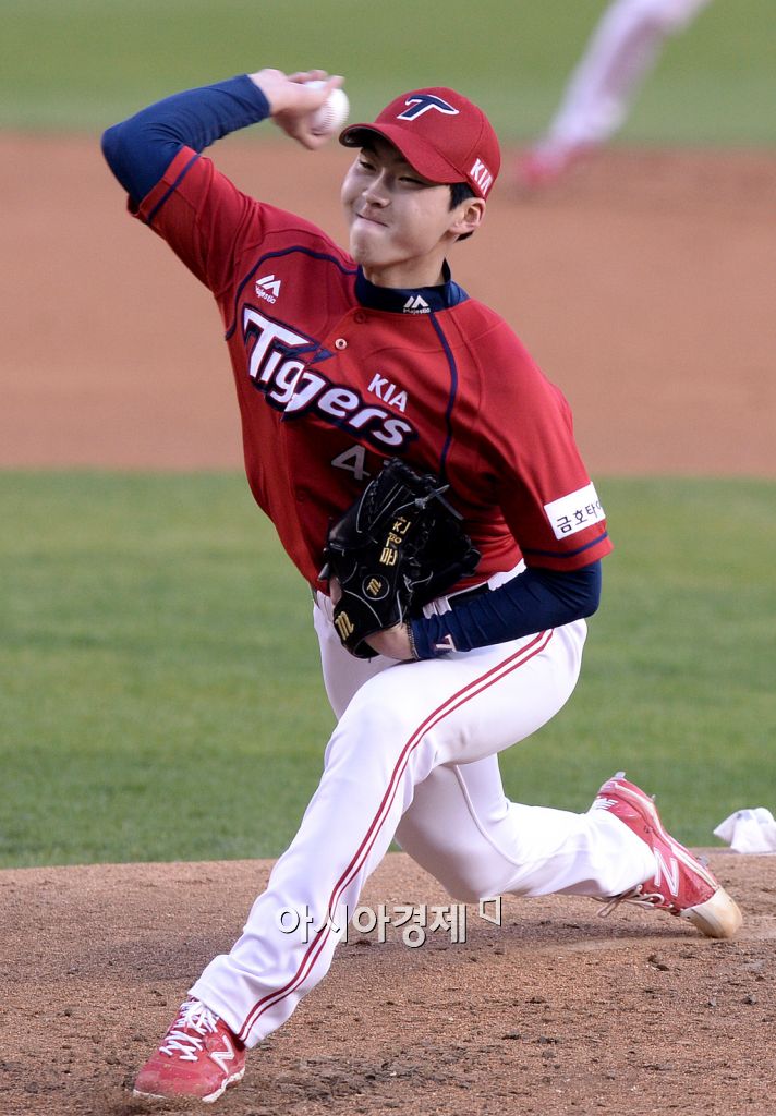 [잠실=아시아경제 김현민 기자] 2015 타이어뱅크 KBO리그 KIA 타이거즈와 두산 베어스의 경기가 24일 잠실야구장에서 열렸다. KIA 선발 문경찬이 역투하고 있다.