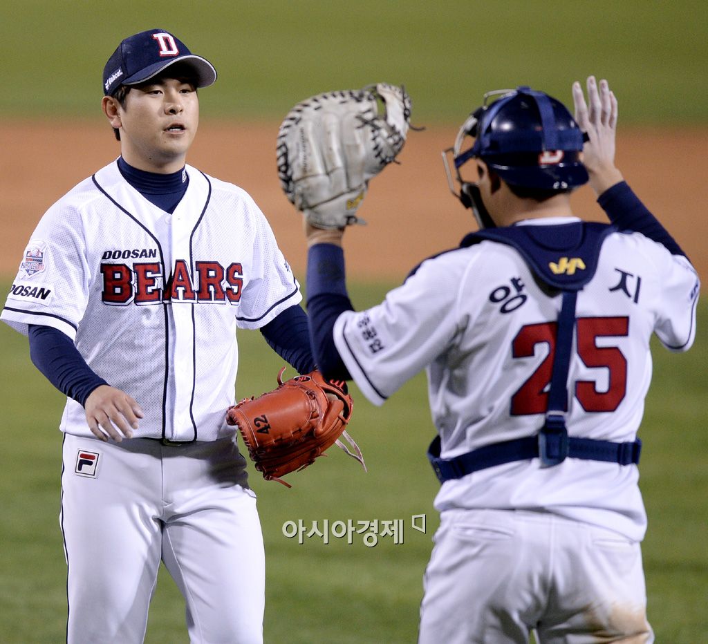 [잠실=아시아경제 김현민 기자] 2015 타이어뱅크 KBO리그 KIA 타이거즈와 두산 베어스의 경기가 24일 잠실야구장에서 열렸다. 두산 마무리 윤명준이 7-3으로 앞선 9회초 1사 1루에서 KIA 필을 병살로 처리한 뒤 양의지 포수와 기뻐하고 있다. 김현민 기자 kimhyun81@asiae.co.kr<ⓒ세계를 보는 창 경제를 보는 눈, 아시아경제(www.asiae.co.kr) 무단전재 배포금지>