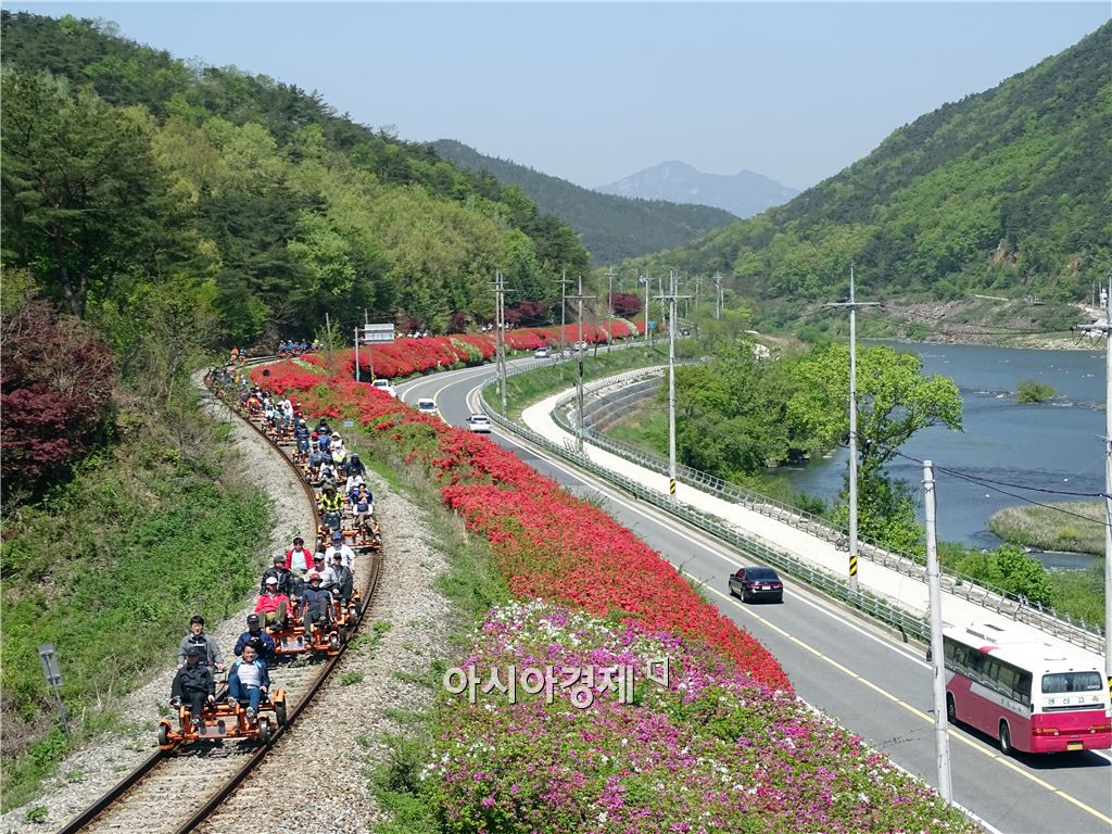초여름 날씨를 보인 25일 오후 전남 곡성군 섬진강변에 철쭉이 만개했다. 이날 가족단위 상춘객들이 레일바이크를 타고 화사하게 핀 철쭉을 보면서 봄을 만끽하고 있다. <br /> <br /> 국도 17호선에 위치한 곡성 섬진강변 철쭉 길은 오곡면에서 압록까지 이어지는 구간으로 우리나라에서 가장 아름다운 드라이브 코스로 남녀노소 할 것 없이 기념사진 촬영장소로 크게 인기를 얻고 있다.<br /> <br /> 또한, 섬진강을 배경으로 강길, 자전거길, 찻길, 철쭉 길, 기찻길, 레일바이크 길, 숲 길이 조성돼 있고, 멈춰 서서 쉬어가고 싶은 힐링의 장소로 매년 수많은 관광객이 꾸준히 방문하고 있는 곡성군 관광명소이다.