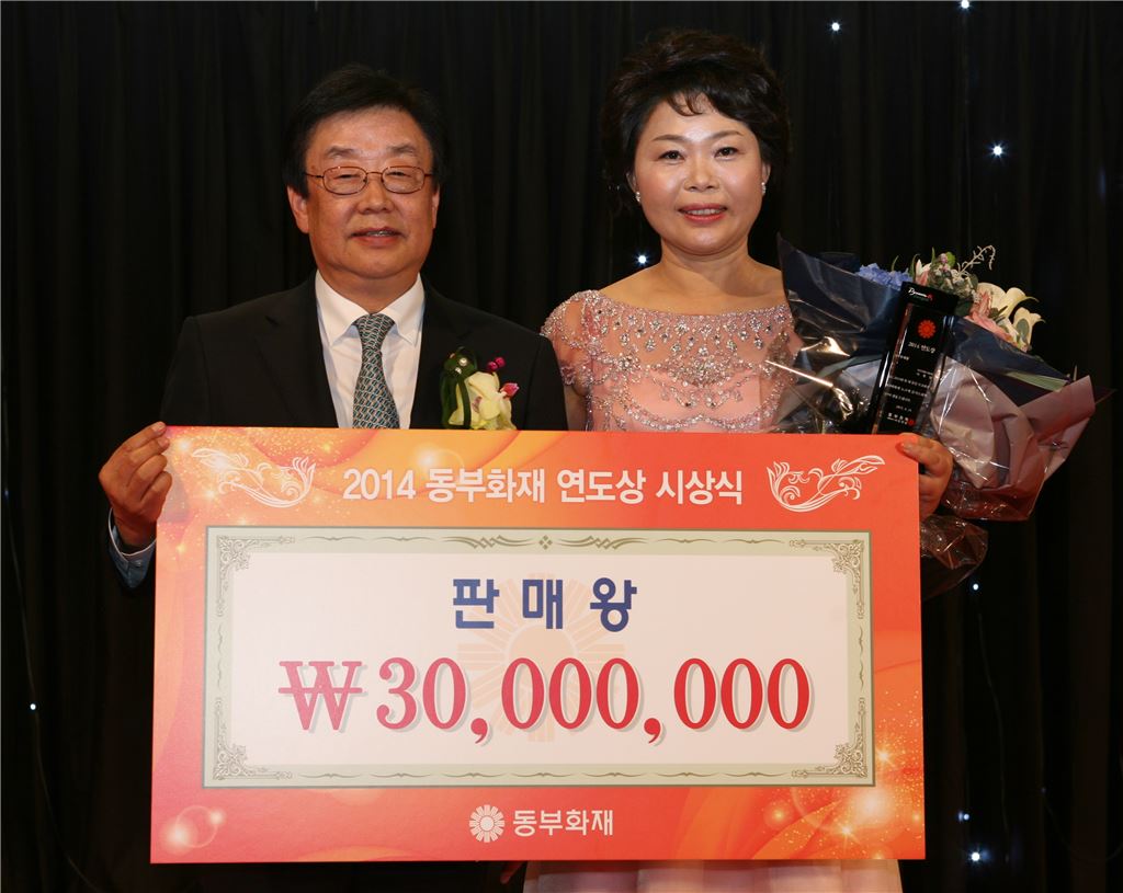 김정남 동부화재 사장(왼쪽)과 판매왕의 영예를 안은 이복남 중앙사업단 용산지점 PA가 기념촬영을 하고 있다.