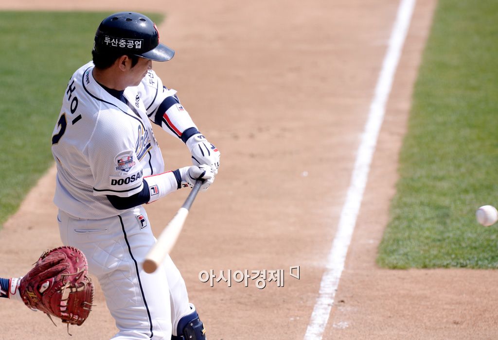[잠실=아시아경제 김현민 기자] 2015 타이어뱅크 KBO리그 KIA 타이거즈와 두산 베어스의 경기가 26일 잠실야구장에서 열렸다. 2회말 1사 1,2루에서 두산 최재훈이 선취 1타점 적시타를 치고 있다. 김현민 기자 kimhyun81@asiae.co.kr<ⓒ세계를 보는 창 경제를 보는 눈, 아시아경제(www.asiae.co.kr) 무단전재 배포금지>