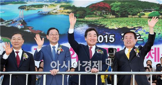 제54회 전라남도체육대회가 27일 오후 진도공설운동장에서 열린 가운데 (오른쪽부터)이동진 진도군수, 이낙연 도지사, 명현관 도의장, 장만채 전남교육감이 입장하는 시군 선수단에게 손을 흔들며 격려하고 있다. 사진제공=전남도