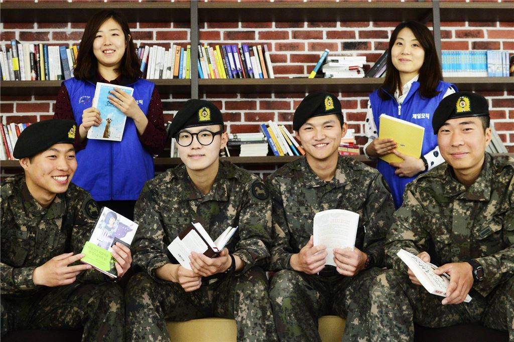 제일모직이 경기도 일산 육군 9사단 백마부대 전차대대에 마련한 북 카페(book cafe)에서 제일모직 직원들과 전차대대 병사들이 함께 책을 보고 있다.