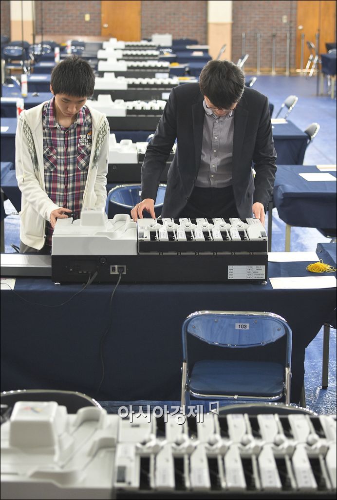 [아시아경제 윤동주 기자] 재보궐 선거를 하루 앞둔 28일 서울 관악구 인헌초등학교에 설치된 개표소에서 선관위 관계자들이 투표지 분류기를 점검하고 있다.윤동주 기자 doso7@asiae.co.kr<ⓒ세계를 보는 창 경제를 보는 눈, 아시아경제(www.asiae.co.kr) 무단전재 배포금지>