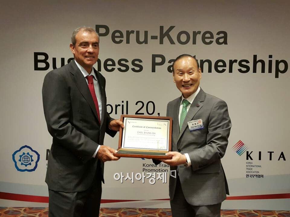 지난 20일 페루 리마에서 프랑소아 패티 잉카그룹 회장(왼쪽)이 최병오 패션그룹형지 회장에게 감사패를 전달하고 있다. <br /> <br />