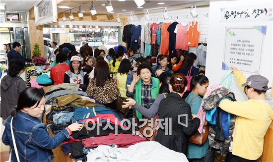 광주시 광산구 송정1동 주민자치위원회(위원장 강광민)가 28일 동 주민센터 입구에 있는 ‘송정나눔장터’새 단장 기념 바자회를 열었다.<br />