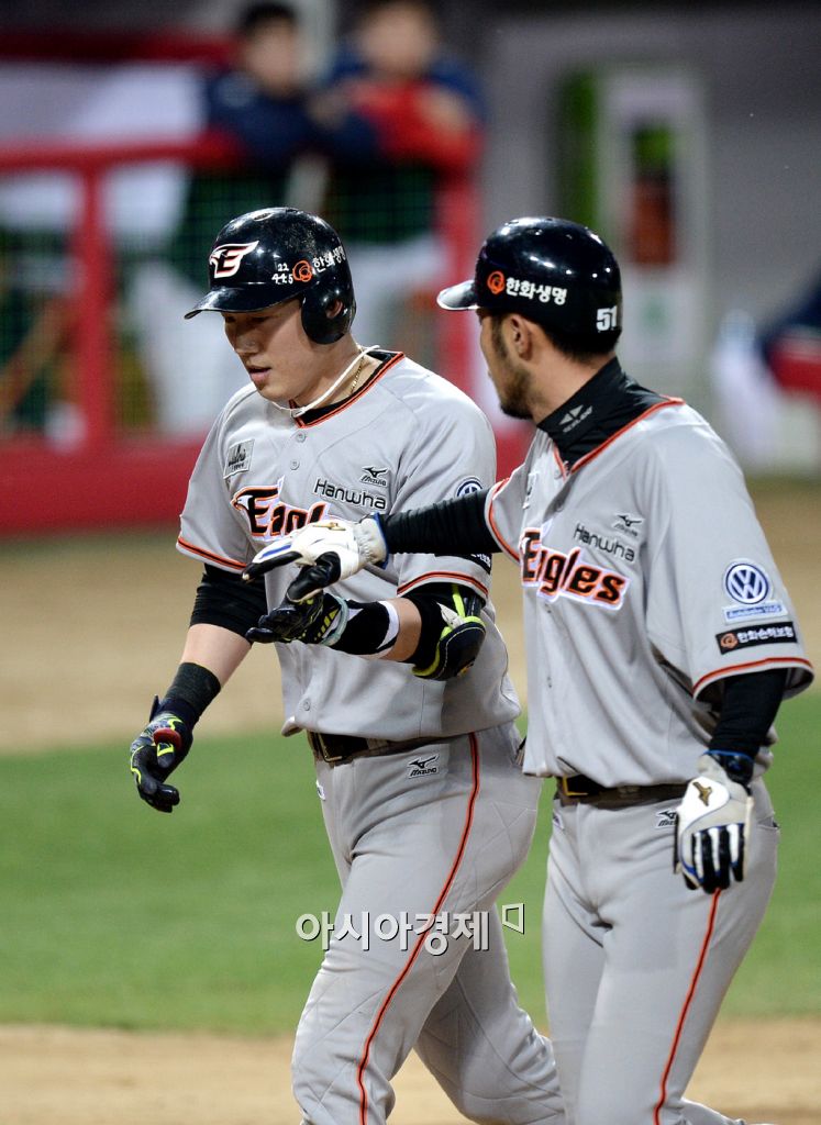 [광주=아시아경제 김현민 기자] 2015 타이어뱅크 KBO리그 한화 이글스와 KIA 타이거즈의 경기가 30일 광주구장에서 열렸다. 4회초 2사 1루에서 한화 김회성이 KIA 선발 양현종을 상대로 추가 투런 홈런을 치고 선행주자 김경언과 하이파이브하고 있다.