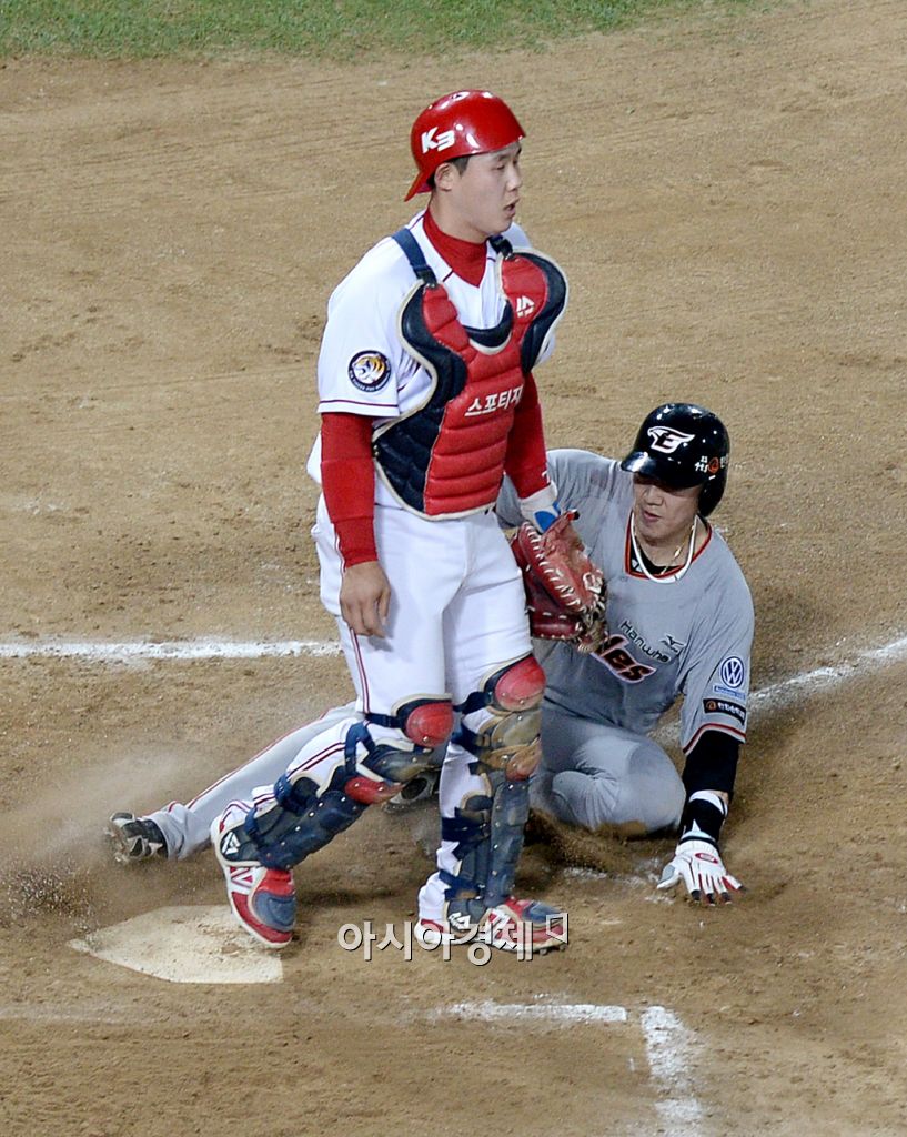 [광주=아시아경제 김현민 기자] 2015 타이어뱅크 KBO리그 한화 이글스와 KIA 타이거즈의 경기가 30일 광주구장에서 열렸다. 9회초 1사 만루에서 한화 이용규의 2루수 땅볼 때 3루주자 김회성이 득점하고 있다.김현민 기자 kimhyun81@asiae.co.kr<ⓒ세계를 보는 창 경제를 보는 눈, 아시아경제(www.asiae.co.kr) 무단전재 배포금지>