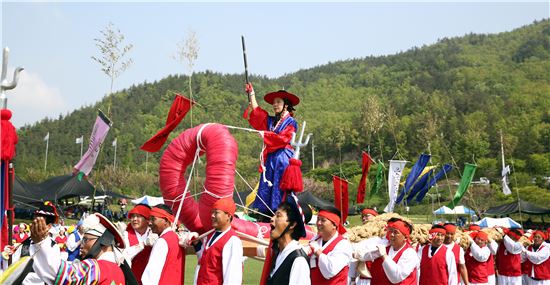 [아시아경제 노해섭 ]‘함께해요 해남군민 열어가요 희망해남’라는 슬로건 아래 진행된 제42회 해남군민의 날 행사가 1일 우슬경기장 일원에서 성대히 종료됐다.2만7천여 명의 군민과 향우가 참여해 개최된 이번 행사는 읍면의 화합을 다지고 그동안 갈고닦은 기량을 겨루는 민속경기로 윷놀이, 단체줄넘기, 추억의 고무신 던지기 등 7개 종목, 체육경기로 축구, 게이트볼, 씨름 등 9개 종목이 펼쳐졌다.특히 500년 전통의 북평 용줄다리기가 읍면 풍물놀이팀의 합동공연이 식전행사로 시연되며 해남군민을 하나로 묶어냈다. 마지막 성화봉송주자는 2014년 장애인 국가대표 볼링 선수이자 지난 2월 ‘자랑스러운 해남인’상을 받은 민진호 씨와 2015년 1월1일 새해 첫 번째 출산을 한 윤상미 씨가 나서 화합의 불을 밝혔다.북평 용줄다리기