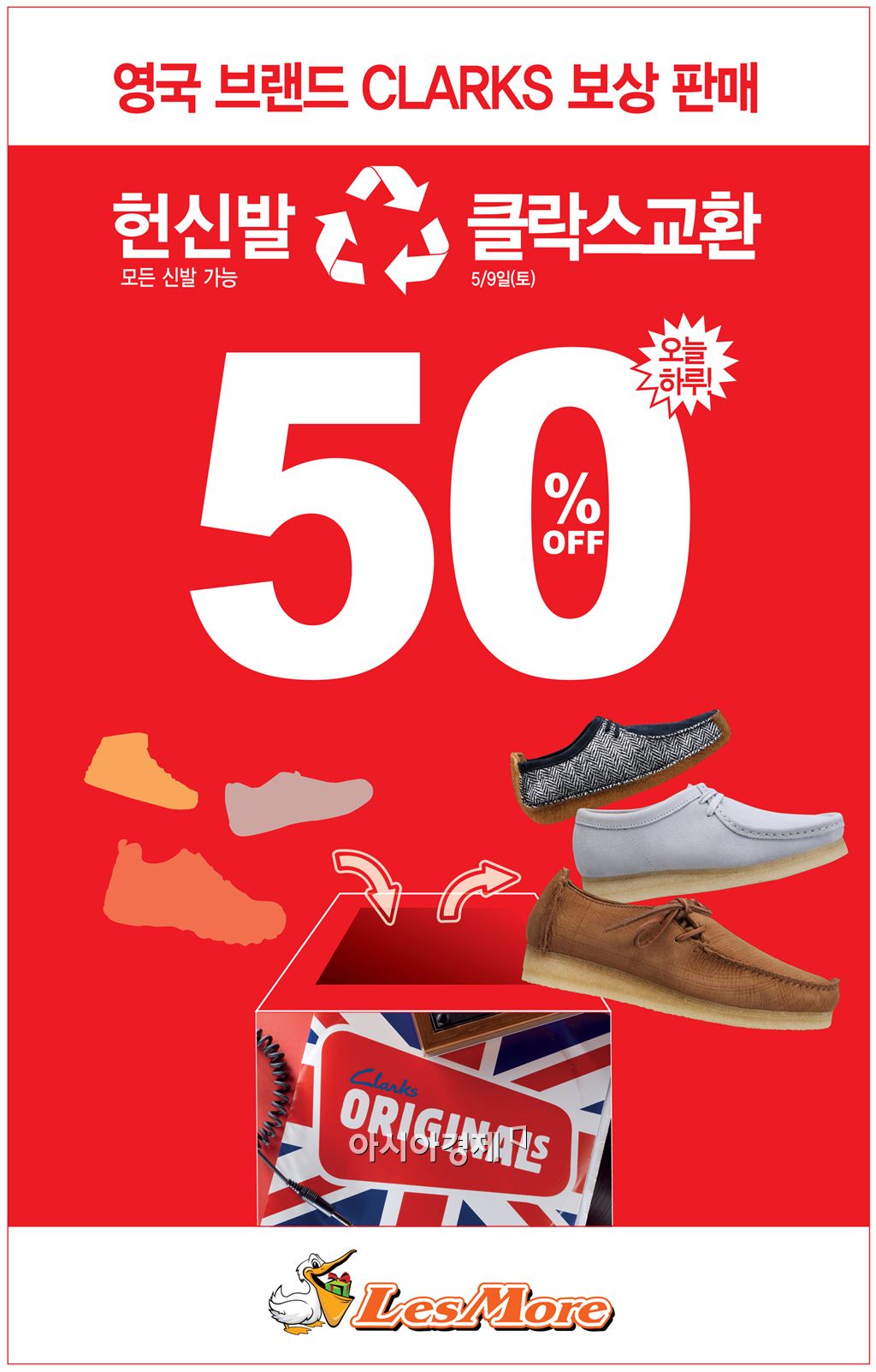 [아시아경제 김현정 기자] 슈즈 멀티숍 레스모아가 영국 캐주얼 슈즈 브랜드 클락스와 함께 ‘클락스 브링 미 백(BRING ME BACK)’캠페인을 실시한다고 4일 밝혔다. 오는 9일 하루 실시되는 이번 행사는 브랜드에 상관없이 헌 신발을 가져오는 고객에게 클락스 신발 구입 시 50% 할인 혜택을 제공한다. 1인당 제품 1개에 한정되며 서울, 부산, 대구, 광주, 대전, 제주 등에 위치한 8개 레스모아 매장에서 총 300명을 대상으로 선착순 진행된다. 행사가 진행되는 레스모아 매장에서는 남녀노소 모두 사랑 받는 클락스의 베스트셀러 아이템 ‘러거(LUGGER)’부터, 베이직한 디자인에 가벼운 아웃솔로 여름에도 신을 수 있는 ‘왈라비 에어리얼(Wallabee Aerial)’, 트렌디한 디자인과 뛰어난 쿠셔닝을 제공하는 여름 샌들 ‘웨이브 샤인(Wave Shine)’ 등 클락스 인기 제품들을 단 하루, 반값에 구매 할 수 있다. 김현정 기자 alphag@asiae.co.kr<ⓒ세계를 보는 창 경제를 보는 눈, 아시아경제(www.asiae.co.kr) 무단전재 배포금지>