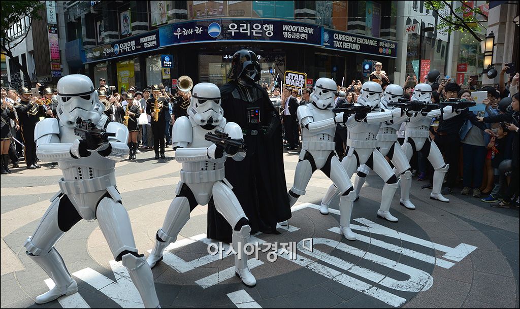 [아시아경제 윤동주 기자] 4일 서울 중구 명동거리에서 스타워즈 악의 화신 다스베이더와 스톰투루퍼가 관광객들과 시민들을 위협하며 검은포스 행진을 하고 있다.윤동주 기자 doso7@asiae.co.kr<ⓒ세계를 보는 창 경제를 보는 눈, 아시아경제(www.asiae.co.kr) 무단전재 배포금지>