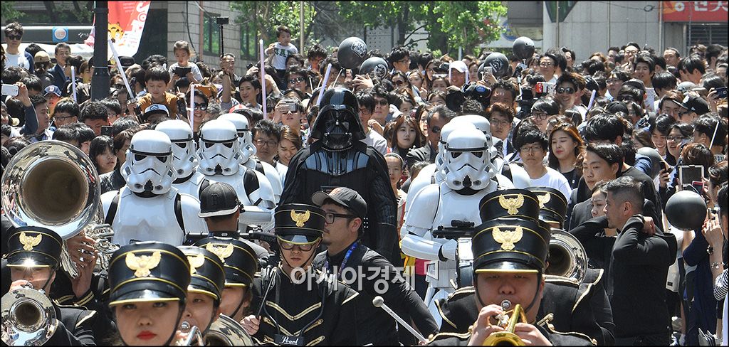 [아시아경제 윤동주 기자] 4일 서울 중구 명동거리에서 스타워즈 악의 화신 다스베이더와 스톰투루퍼가 관광객들과 시민들을 위협하며 검은포스 행진을 하고 있다.윤동주 기자 doso7@asiae.co.kr<ⓒ세계를 보는 창 경제를 보는 눈, 아시아경제(www.asiae.co.kr) 무단전재 배포금지>