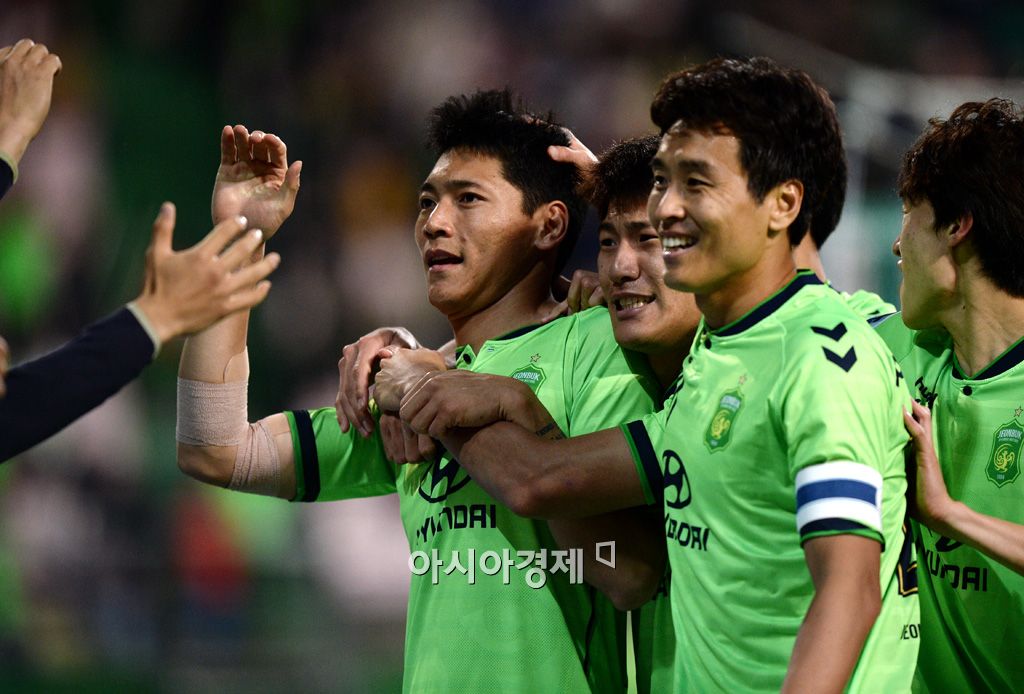 [전주=아시아경제 김현민 기자] 프로축구 전북 현대가 6일 전주월드컵경기장에서 산둥 루넝(중국)와 AFC 챔피언스리그 조별리그 최종전을 치렀다. 전북 김형일이 후반 헤딩 추가골을 성공시키고 동료들과 기뻐하고 있다. 김현민 기자 kimhyun81@asiae.co.kr<ⓒ세계를 보는 창 경제를 보는 눈, 아시아경제(www.asiae.co.kr) 무단전재 배포금지>
