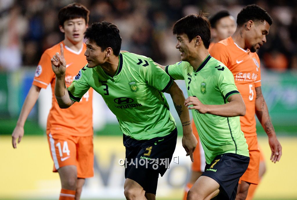 [전주=아시아경제 김현민 기자] 프로축구 전북 현대가 6일 전주월드컵경기장에서 산둥 루넝(중국)와 AFC 챔피언스리그 조별리그 최종전을 치렀다. 전북 김형일이 후반 헤딩 추가골을 성공시키고 동료들과 기뻐하고 있다. 김현민 기자 kimhyun81@asiae.co.kr<ⓒ세계를 보는 창 경제를 보는 눈, 아시아경제(www.asiae.co.kr) 무단전재 배포금지>