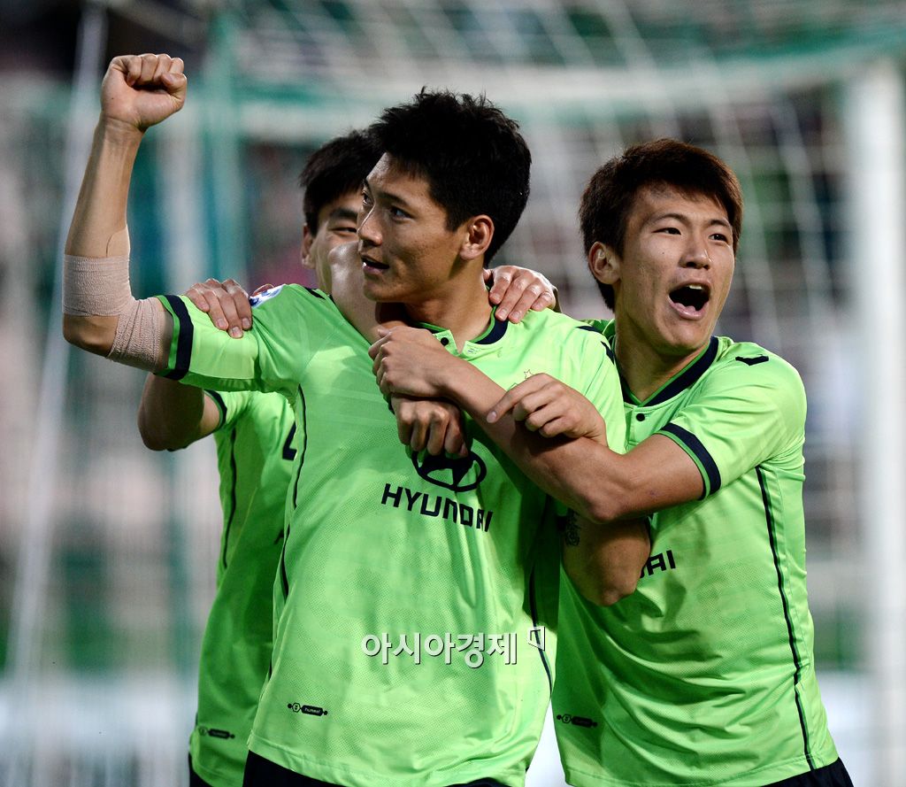 [전주=아시아경제 김현민 기자] 프로축구 전북 현대가 6일 전주월드컵경기장에서 산둥 루넝(중국)와 AFC 챔피언스리그 조별리그 최종전을 치렀다. 전북 김형일이 후반 헤딩 추가골을 성공시키고 동료들과 기뻐하고 있다.